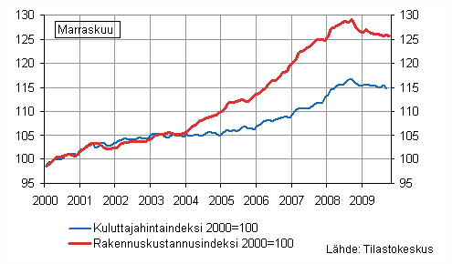 Rakennuskustannusindeksi 2000=100 ja kuluttajahintaindeksi 2000=100