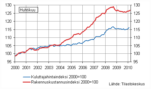 Rakennuskustannusindeksi 2000=100 ja kuluttajahintaindeksi 2000=100