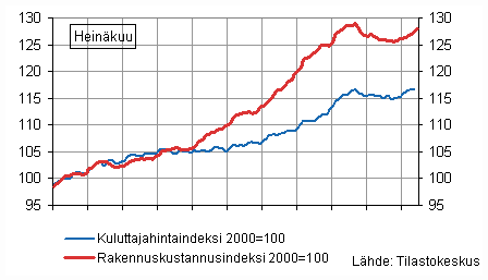 Rakennuskustannusindeksi 2000=100 ja kuluttajahintaindeksi 2000=100