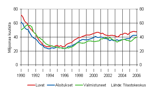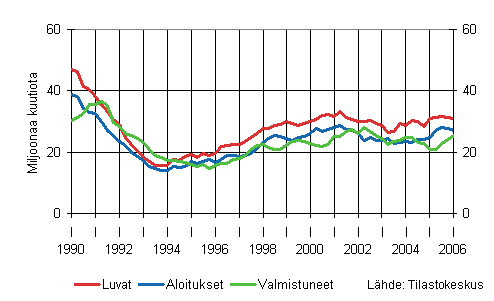 Rakennusluvanvarainen uudisrakentaminen vuoden 2006 ensimmäisellä neljänneksellä oli yhtä vilkasta kuin vastaavalla ajanjaksolla vuotta aiemmin. Myönnettyjen rakennuslupien mukainen kuutiomäärä kasvoi hieman kun taas aloitettujen rakennushankkeiden yhteenlaskettu kuutiomäärä jäi hieman edellisvuotista alemmalle tasolle. Vuoden 2005 alkupuolella aloitettiin runsaasti uudisrakennushankkeita, mikä näkyy valmistuneiden rakennusten kuutiomäärän selvänä kasvuna vuoden 2005 lopulla ja vuoden 2006 alussa.