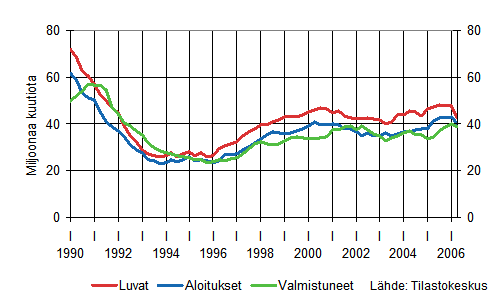 Rakennusluvanvarainen uudisrakentaminen väheni vuoden 2006 toisella neljänneksellä. Myönnettyjen rakennuslupien mukainen kuutiomäärä väheni 14 prosenttia, aloitettujen rakennusten 19 prosenttia ja valmistuneiden rakennusten 2 prosenttia vuodentakaisesta. Kuutiomäärät vähenivät sekä asuinrakentamisessa että muussa talonrakentamisessa.