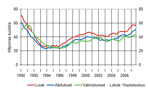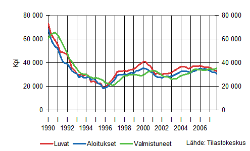 Asuinrakentamisen vuosia jatkunut kasvu tasaantui vuonna 2006 ja kääntyi lievään laskuun vuonna 2007. Vuonna 2007 aloitettiin noin 30 500 uuden asunnon rakennustyöt, mikä on noin 3 500 asuntoa vähemmän kuin vuotta aiemmin. Aloitusten väheneminen näkyy kaikissa asuinrakennustyypeissä: Omakotitaloasunnot -1 400 kpl, rivitaloasunnot -1 400 kpl ja kerrostaloasunnot -700 kpl. Vuonna 2007 myönnettiin rakennusluvat noin 32 700 uudelle asunnolle, mikä on 8 prosenttia vähemmän kuin vuotta aiemmin.