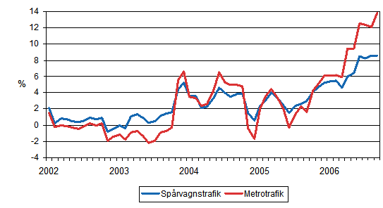 Enligt Statistikcentralen ökade kostnaderna för spårbunden trafik med 10,3 procent från september år 2005 till september år 2006. Kostnaderna för spårvagnstrafiken gick upp med 8,6 procent på årsnivå och kostnaderna för metrotrafiken med 13,8 procent.