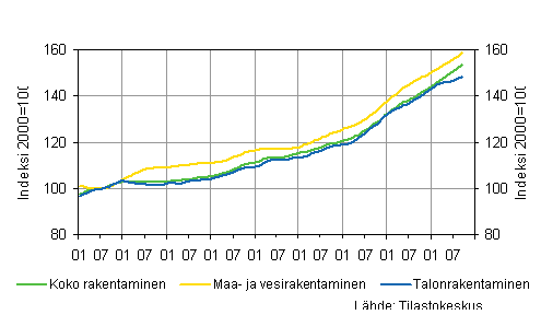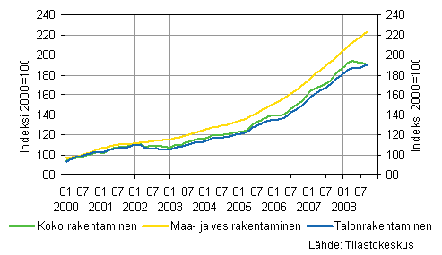 Vuoden 2008 tammi-syyskuussa uudisrakennustöitä käynnistettiin kaikkiaan noin 33 miljoonan kuutiometrin edestä, mikä on viidenneksen vähemmän kuin vuotta aiemmin. Aloitettujen liike- ja toimistorakennusten kuutiomäärä väheni runsaan kolmanneksen ja teollisuus- ja varastorakennusten neljänneksen vuotta aiemmasta. Vain julkisten palvelurakennusten kuutiomäärä kasvoi edellisvuotisesta. Tammi-syyskuussa aloitettiin kaikkiaan lähes 21 000 uuden asunnon rakennustyöt, mikä on vajaan viidenneksen vähemmän kuin vastaavana aikana vuosi sitten.