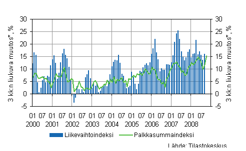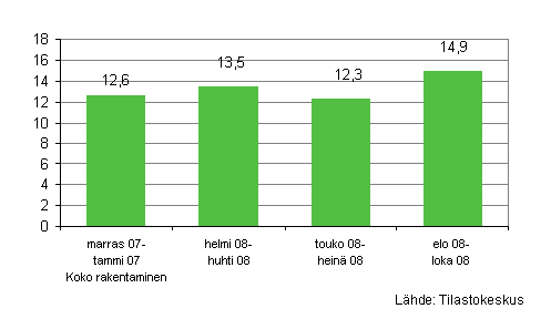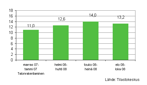 Talonrakennusyritysten elo-lokakuussa 2008 maksama palkkasumma oli 14,8 prosenttia vuoden takaista vastaavaa ajanjaksoa suurempi. Lokakuun palkkasumma oli 22,4 prosenttia edellisvuoden lokakuun palkkasummaa suurempi.