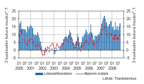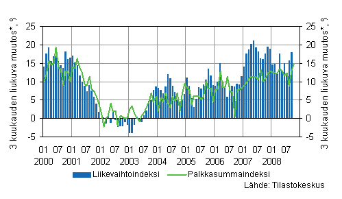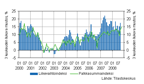 Rakennusyritysten liikevaihto kasvoi vuoden 2008 kolmannella neljänneksellä 17,3 prosenttia vuoden 2007 vastaavasta ajanjaksosta. Vuoden 2008 heinäkuussa liikevaihto kasvoi 16,2 prosenttia edellisen vuoden heinäkuuhun verrattuna. Elokuussa kasvua oli 17,9 prosenttia ja syyskuussa 17,8 prosenttia. Tiedot käyvät ilmi Tilastokeskuksen rakentamisen liikevaihtokuvaajan ennakkotiedoista.