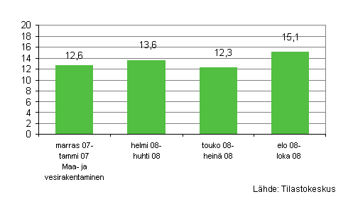 Maa- ja vesirakennusyritysten maksama palkkasumma kasvoi 15 prosenttia elo-lokakuussa 2008