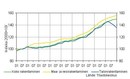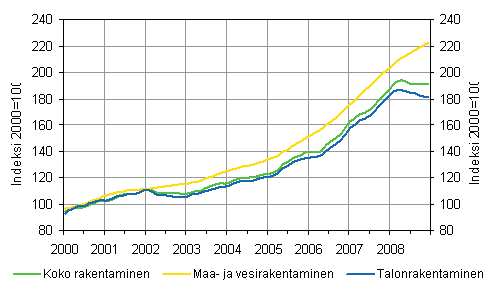 Vuonna 2008 uudisrakennustöitä käynnistettiin kaikkiaan noin 41 miljoonan kuutiometrin edestä, mikä on viidenneksen vähemmän kuin vuotta aiemmin. Aloitettujen liike- ja toimistorakennusten kuutiomäärä väheni vajaan kolmanneksen ja teollisuus- ja varastorakennusten lähes neljänneksen vuotta aiemmasta. Viime vuonna aloitettiin kaikkiaan runsaan 24 000 uuden asunnon rakennustyöt, mikä on viidenneksen vähemmän kuin vuonna 2007.