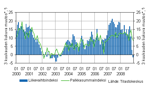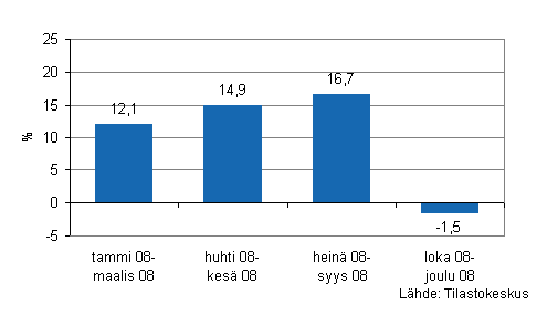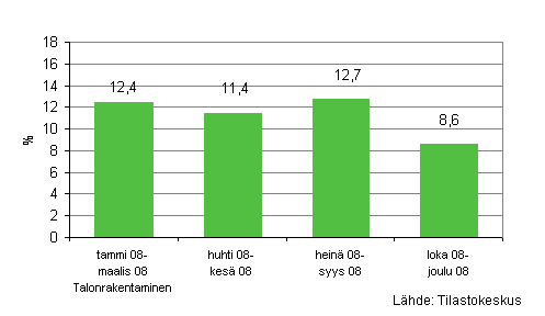 Talonrakennusyritysten liikevaihto väheni vuoden 2008 loka-joulukuussa 1,5 prosenttia edellisen vuoden vastaavaan ajanjakson nähden. Joulukuussa 2008 liikevaihto oli pysynyt lähes samana verrattuna vuoden 2007 joulukuuhun, kasvua kertyi vain 0,8 prosenttia.