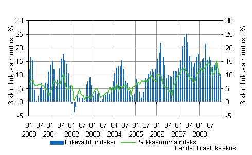 Rakennusyritysten maksaman palkkasumman kasvu on ollut vuonna 2008 maltillista, noin 10 prosentin luokkaa. Vuoden 2008 kolmannella vuosineljänneksellä palkkasumman kasvu oli 12,4 prosenttia ja viimeisellä neljänneksellä 8,8 prosenttia vuoden 2007 vastaavasta ajankohdasta. Joulukuussa 2008 palkkasumma oli 8 prosenttia suurempi kuin vuoden 2007 joulukuussa.