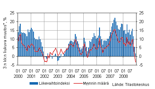 Rakennusyritysten myynnin määrä kääntyi vuoden 2008 viimeisellä neljänneksellä laskuun ollen 3,4 prosenttia pienempi vastaavaan vuoden 2007 neljännekseen verrattuna. Talonrakennusyritysten myynnin määrä väheni 5,3 prosenttia ja maa- ja vesirakennusyritysten myynnin määrä kasvoi 4,3 prosenttia vuoden 2007 viimeiseen neljännekseen verrattuna.