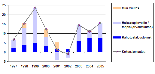 Kotitalouksien rahoitusvarallisuus kasvoi viime vuonna 15,5 miljardia euroa. Kasvusta 8 miljardia syntyi sijoitusten arvonnoususta, joka rahoitustilinpidossa kirjataan hallussapitovoittona. Kasvu on ollut tätä voimakkaampaa vain vuonna 1999, jolloin rahoitusvarat kasvoivat osakekurssien nousun siivittämänä peräti 23 miljardia euroa. Vuoden 2005 lopussa kotitalouksien rahoitusvarojen arvo oli 175 miljardia euroa, josta osakkeiden osuus oli 62 miljardia euroa.