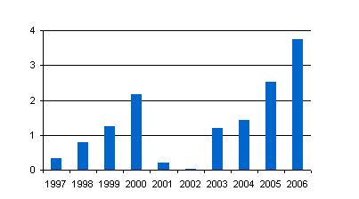 Kotitalouksien rahasto-osuuksien nettohankinnat 1997-2006, miljardia euroa