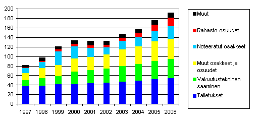 Kotitalouksien rahoitusvarat 1997-2006, miljardia euroa