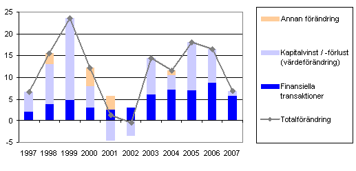 Förändring av hushållens finansiella förmögenhet 1997-2007, miljarder euro