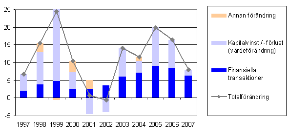 Förändring av hushållens finansiella förmögenhet 1997-2007, miljarder euro