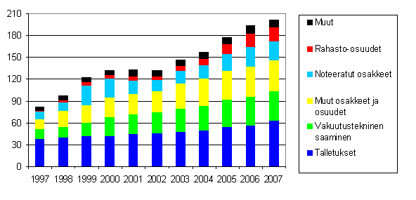 Kotitalouksien rahoitusvarat 1997-2007, mrd. euroa