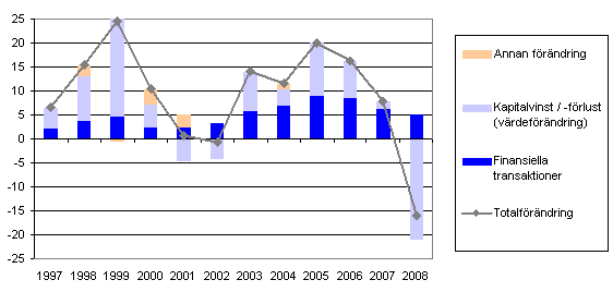 Förändring av hushållens finansiella förmögenhet 1997-2008, miljarder euro