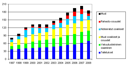Kotitalouksien rahoitusvarat 1997-2008, mrd euroa