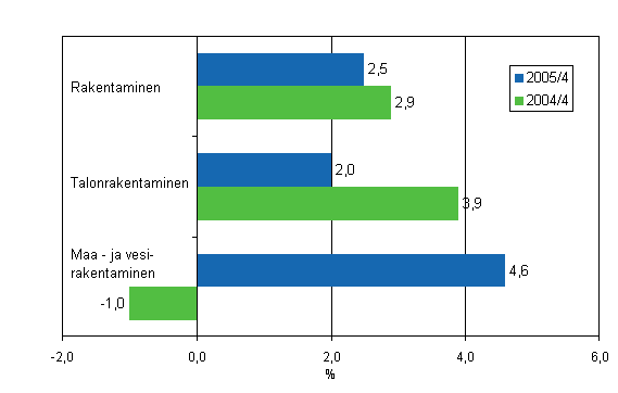 Rakennusyritysten myynnin määräindeksi oli vuoden 2005 viimeisellä vuosineljänneksellä 2,5 prosenttia suurempi kuin vastaavana aikana vuotta aiemmin. Edellisvuoden saman ajanjakson kasvu oli lähes 3 prosenttia.