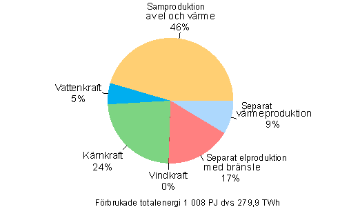 Figur 3. Förbrukad totalenergi efter produktionsform vid el- och värmeproduktionen år 2004