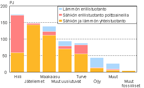 Kuvio 5. Polttoaineiden käyttö tuotantomuodoittain sähkön ja lämmön tuotannossa 2004