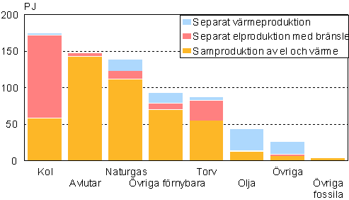 Av olika bränslen inom el- och värmeproduktionen användes främst kol år 2004. Andelen uppgick till 24 procent. Träförädlingsindustrins avlutar, dvs. svartlut, stod för 21 procent och naturgas för 19 procent. De vanligaste bränslen inom samproduktion av el- och värme var träförädlingsindustrins avlutar, dvs. 31 procent och naturgas, dvs. 24 procent. Det överlägset vanligaste bränslet inom separat elproduktion var kol. Andelen uppgick till 66 procent. När det gäller värme producerades närmare 80 procent vid samproduktion av el och värme. Vid separat värmeproduktion förbrukades mest oljor, dvs. 34 procent av de förbrukade bränslena.