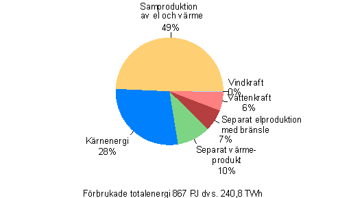 Figur 4. Förbrukad totalenergi efter produktionsform inom el- och värmeproduktion år 2005