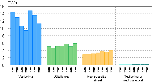 Kuvio 06. Uusiutuvilla energialähteillä tuotettu sähkö 2000-2006