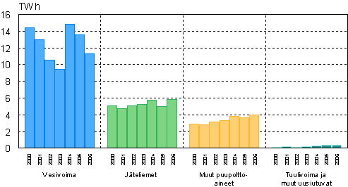 Uusiutuvilla energialähteillä tuotettu sähkö on vesivoiman tuotannon laskun takia vähentynyt viime vuosina. Vuonna 2006 laskua edelliseen vuoteen oli 5 prosenttia. Metsäteollisuuden jäteliemillä tuotettiin sähköä kuitenkin 17 prosenttia edellisvuotta enemmän ja muilla puupolttoaineilla 11 prosenttia enemmän.