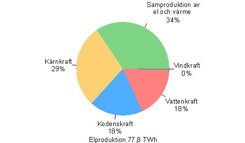 Samproduktionen av el och värme var den mest betydande formen för produktion av el, 34 procent av elen producerades genom samproduktion. Jämfört med året innan var minskningen 3 procent. Mängden el som producerats med kärnenergi steg med 2 procent och dess andel av elproduktionen uppgick till 29 procent. Kondenskraften minskade med nästan en femtedel, vilket å sin sida gjorde att kondenskraftens andel inom elproduktionen sjönk till 18 procent. På grund av att vattenåret var bättre än åren innan ökade produktionen av vattenkraft med 24 procent, vilket höjde dess andel till 18 procent. Produktionen av vindkraft var större än året innan, tillväxten var 23 procent. Vindkraftens andel av elproduktionen var fortfarande 2 promille.