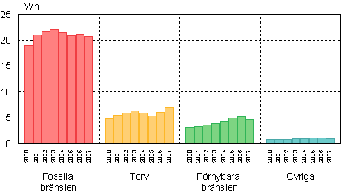 Bränsleandelarna var nästan på samma nivå som året innan. Torven gick förbi träbränslen, båda hade en andel på ungefär 14 procent. På grund av skogsindustrins egen energiproduktion är avlut fortfarande det största bränslet inom samproduktionen, andelen av de använda bränslena är 33 procent. Inom samproduktion av el- och värme sjönk andelen förnybara bränslen till 47 procent år 2007. Användningen av fossila bränslen uppgick till 37 procent och användningen av torv till 14 procent.