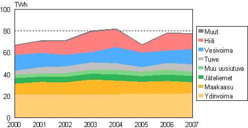Kuvio 04. Sähkön tuotanto energialähteittäin 2000-2007