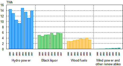 In the 2000s over one-half of the electricity produced with renewable energy sources has been generated with hydro power; in 2007 their proportion stood at 59 per cent. Of the electricity produced with renewable energy sources, black liquor from the forest industry accounted for 24 per cent and other wood fuels for 14 per cent. Wind power and other renewable energy sources generated 2 per cent of the renewable electricity.
