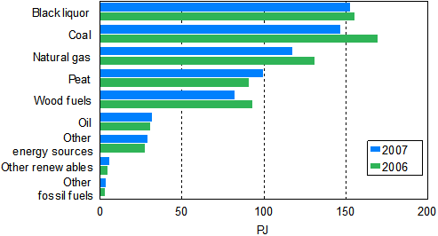 The use of fuels in the production of electricity and heat decreased by 5 per cent in 2007. Use of coal declined most, by 13 per cent. The use of natural gas, wood fuels and black liquor from the forest industry decreased as well. By contrast, use of peat and renewable energy sources (i.a. recycled fuels and biogas) increased.