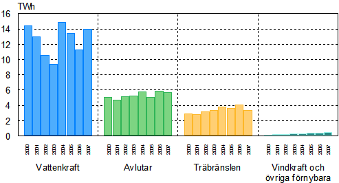Under 2000-talet har mer än hälften av all el som producerats med förnybara energikällor producerats med vattenkraft, år 2007 var vattenkraftens andel 59 procent. När det gäller den förnybara elen var mängden el som producerats med skogsindustrins avlutar 24 procent och mängden el som producerats med andra träbränslen 14 procent. Med vindkraft och andra förnybara bränslen producerades 2 procent.
