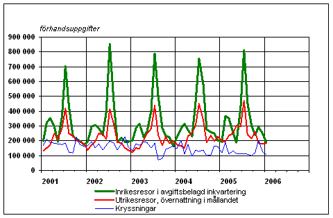 Finländarnas fritidsresor per månad 2001-2006, förhandsuppgifter