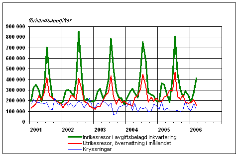Finländarnas fritidsresor per månad 2001-2006, förhandsuppgifter