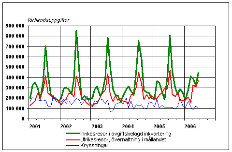 Finländarnas fritidsresor per månad 2001-2006, förhandsuppgifter