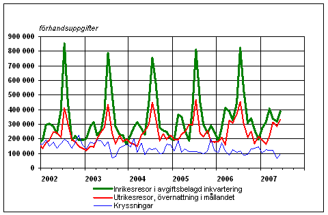Finländarnas fritidsresor per månad 2002-2007, förhandsuppgifter