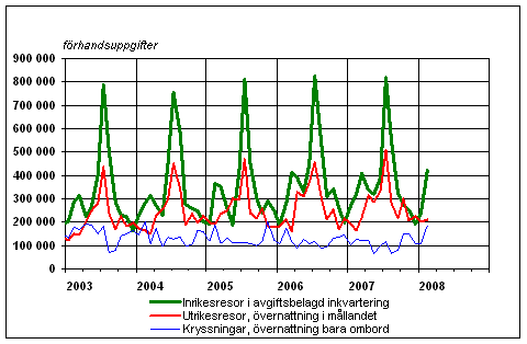 Finländarnas fritidsresor per månad 2003-2008, förhandsuppgifter
