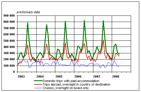 Finnish residents' leisure trips by month 2003-2008, preliminary data