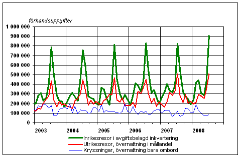 Finländarnas fritidsresor per månad 2003-2008, förhandsuppgifter
