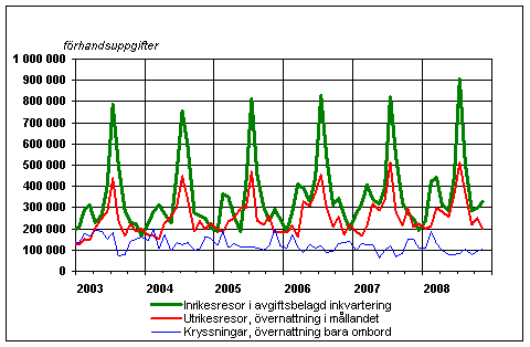 Finländarnas fritidsresor per månad 2003-2008, förhandsuppgifter