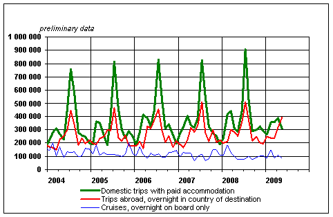 Finnish residents' leisure trips by month 2004-2009, preliminary data
