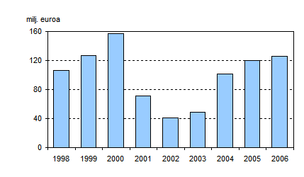 Sijoituspalveluyritysten liikevoitto vuosina 1998 - 2006, miljoonaa euroa