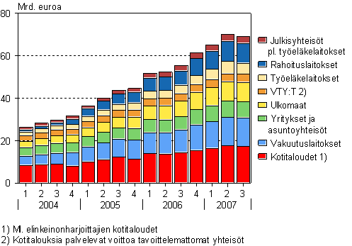Rahasto-osuuksien jakaantuminen omistajasektoreittain ja neljänneksittäin I/2004 - III/2007, mrd. euroa