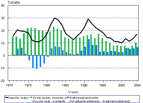 Syntyneiden enemmyys, nettomaahanmuutto ja väestönlisäys 1971 - 2004