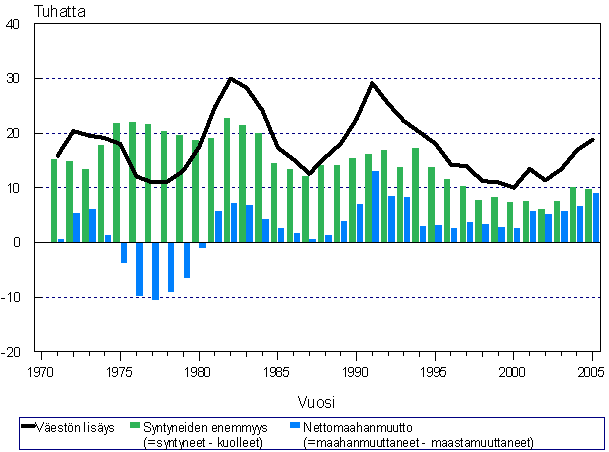 Syntyneiden enemmyys, nettomaahanmuutto ja väestönlisäys 1971 - 2005