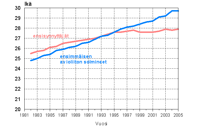 Ensimmäisen avioliiton solmineiden ja ensisynnyttäjien keski-ikä 1981-2005